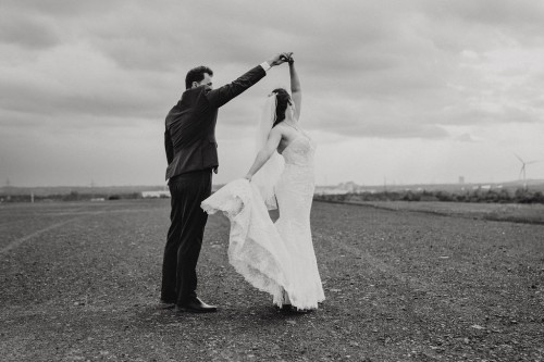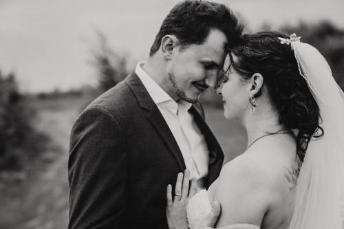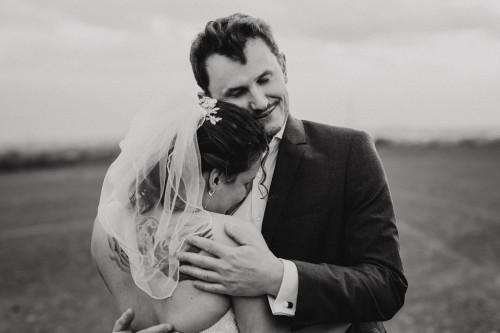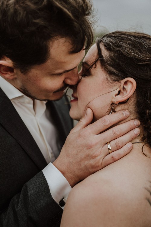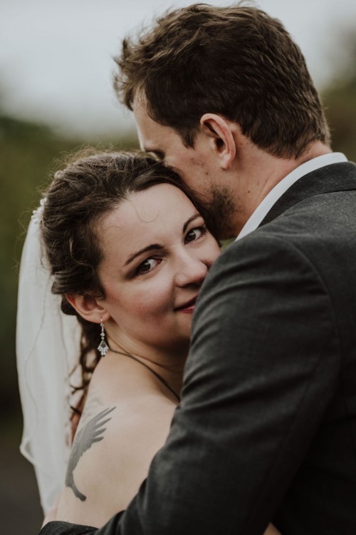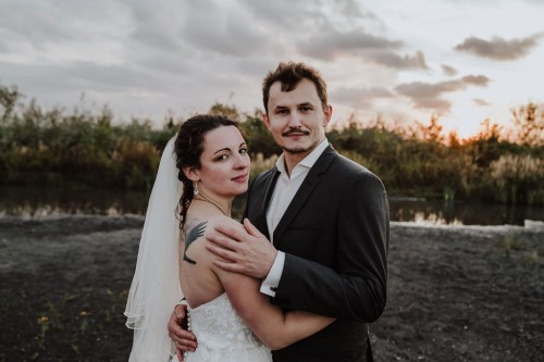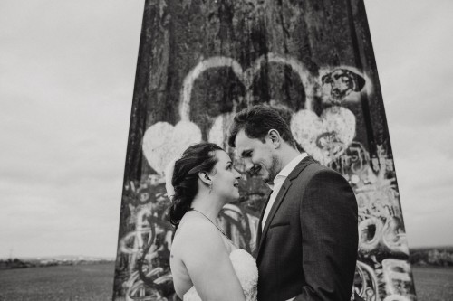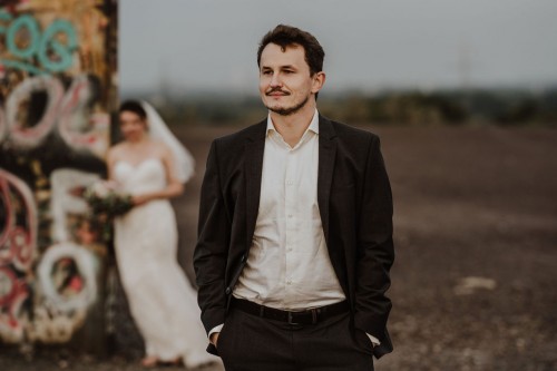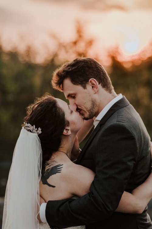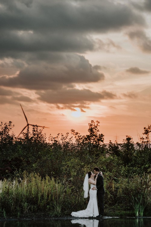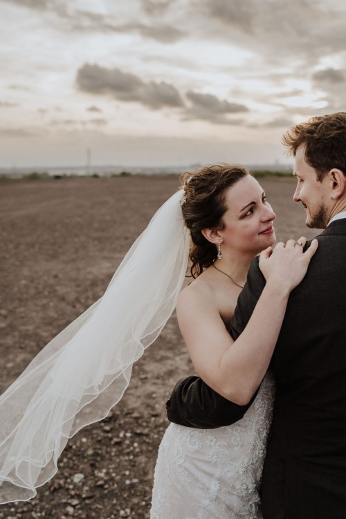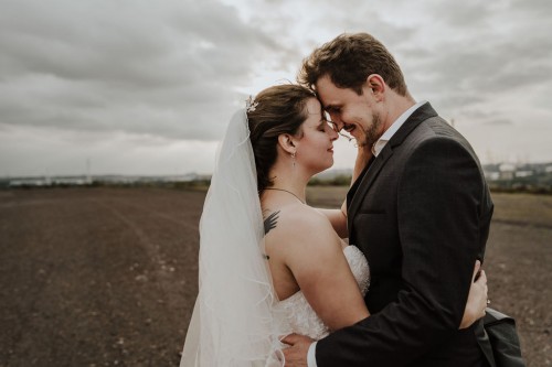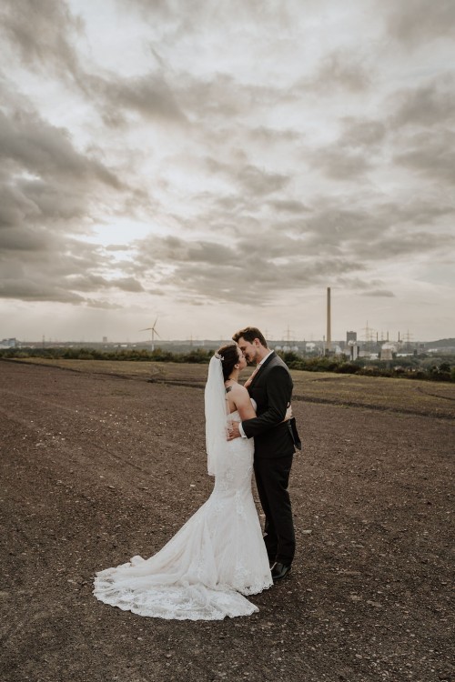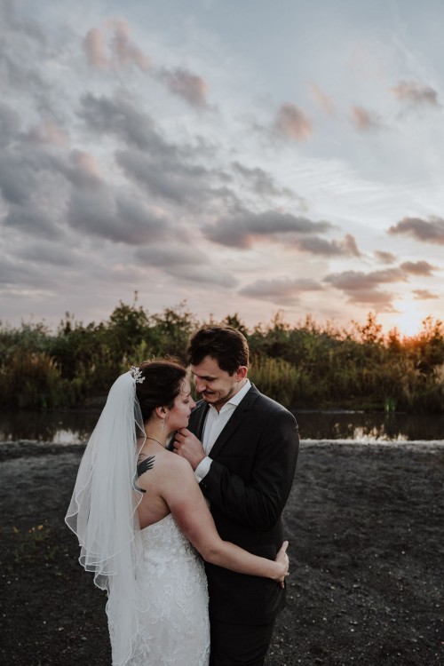 Michelle & Daniel hatten nie den Plan eine große Hochzeit zu feiern. Sie hatten eine gemütliche kleine Feier mit ihren Allerliebsten und haben ihren Hochzeitstag in vollen Zügen genossen. An einem anderen Tag, ganz abseits des Trubels, waren sie mit mir zu einem Afterwedding-Shooting an einem Ort, den die beiden wunderschön finden. Sie beide lieben das Ruhrgebiet, obwohl Daniel gebürtig aus Österreich kommt. Wir haben uns auf der Schurenbachhalde in Essen-Altenessen getroffen und uns dort auch zum ersten Mal gesehen. Auf der Halde ist lediglich eine Bramme aus Stahl, ansonsten ist es sehr karg. Wir haben dort oben auf der menschenleeren Halde tolle ganz entspannte zwei Stunden verbracht und wurden zum Abschluss mit einem tollen Sonnenuntergang belohnt. Michelle und Daniel waren total zärtlich vor der Kamera und hatten viele eigene kreative Ideen, so war es total ungezwungen und hat einfach nur Spaß gemacht. Im Anschluss an unser Shooting sind die beiden in ihre Flitterwochen gefahren. Nicht etwa an weißen Sandstrand … nein … zu Daniels Oma und deren Hühnern nach Österreich.