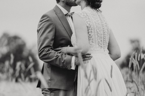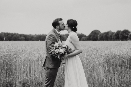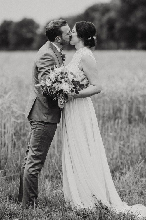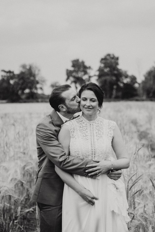 Wir haben uns zum Firstlook in der Kirchhellener Heide getroffen. Jan hat dort in den Feldern auf Vivi gewartet, sie kam von hinten gelaufen und Jan durfte sich erst umdrehen, als sie kurz vor ihm stand. Ein toller und sehr aufregender Moment. Es sind natürlich auch ein paar Tränchen geflossen. Bevor es weiter ging in den Bahnhof Nord zur Freien Trauung haben wir noch ein kleines Paarshooting in den schönen Kornfeldern gemacht.